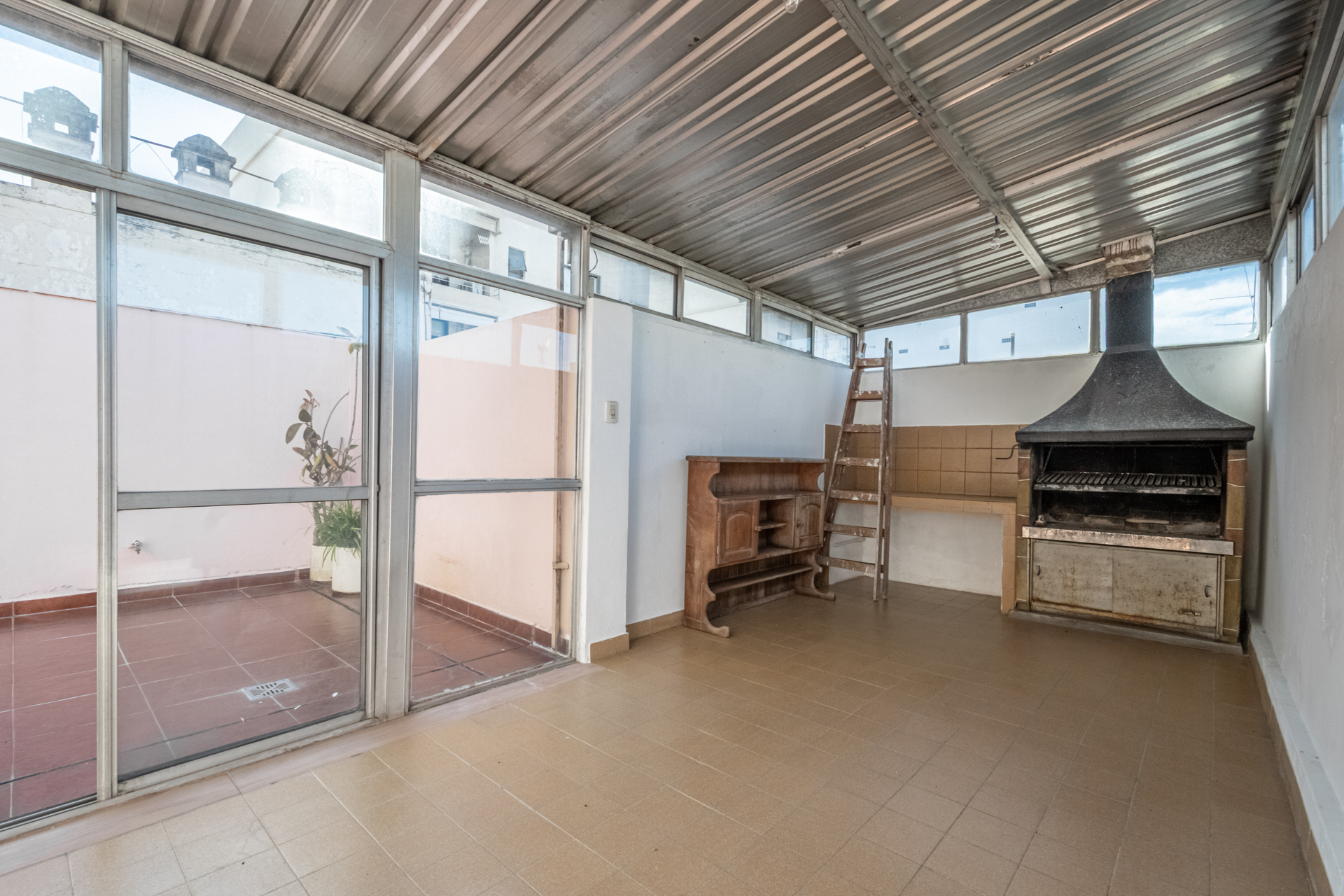 Terraza propia con un quincho techado, con parrilla, y ventanas.
