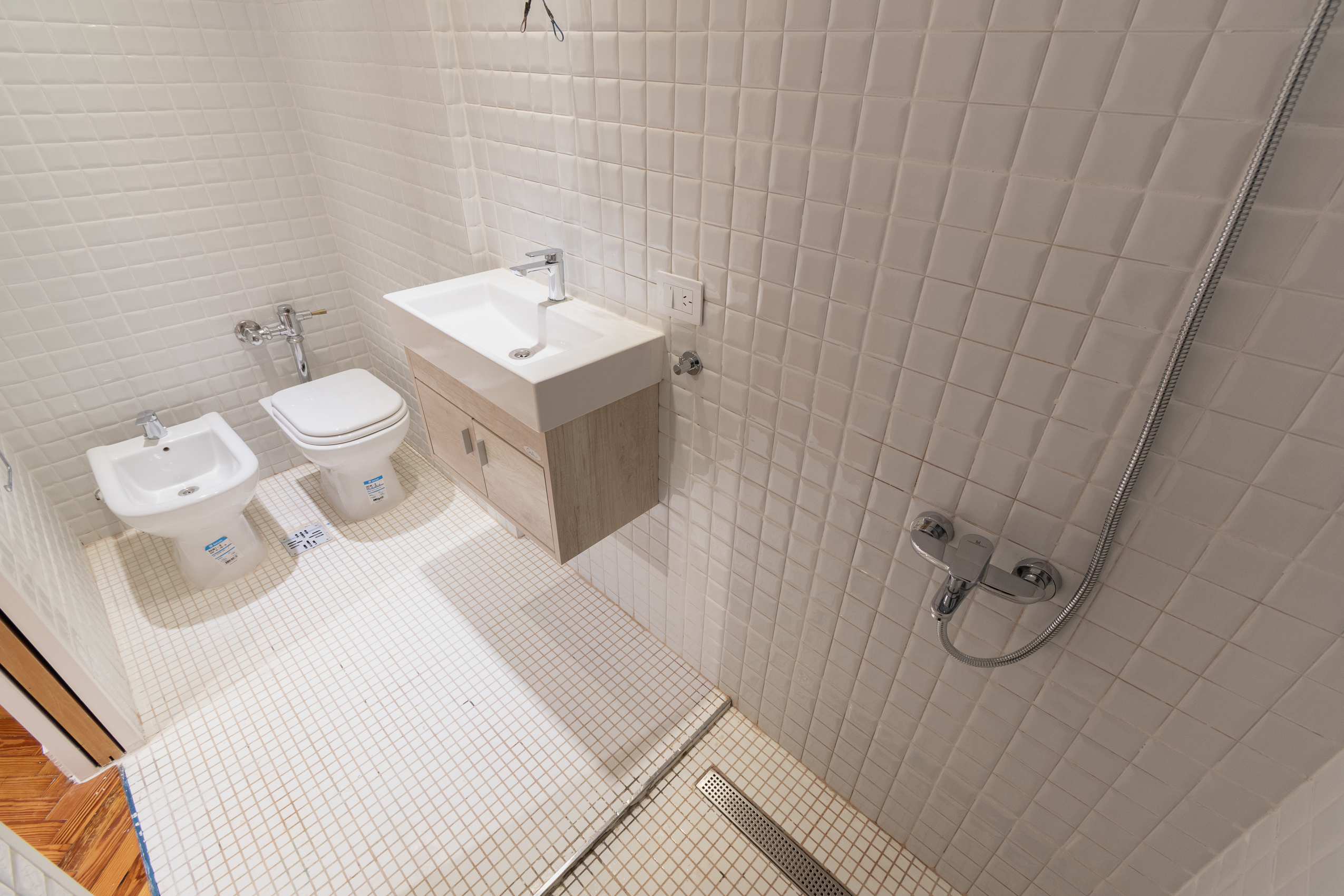 Baño completo con ducha y vanitory, de 2,75 x 1,10 metros.